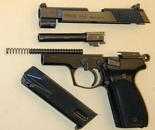 Р88 - самозарядный пистолет, построенный на основе автоматики с коротким ходом ствола. В отличие от предшественников, исаользуется Браунинговская схема с качающимся стволом и запиранием одним массивным боевым упором за окно для экстракции гильз в затворе. Предохранительные механизмы пыполнены по типу Вальтер П5 - внутренний автоматический предохранитель, блокирующий ударник плюс двусторонний рычаг безопасного спуска курка на рамке. В пистолете Р88 Compact от механизма безопасного спуска отказались в пользу более традиционного предохранителя, блокирующего УСМ и управляемого двусторнним рычагом на затворе.