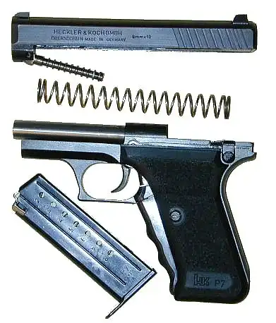 пистолет Heckler-Koch P7 PSP, неполная разборка. в нижней части затвора виден газовый поршень, отвечающий за торможение затвора