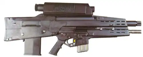 вид на левую сторону XM-29 OICW, демонстрирующий органы управления на прицельном блоке