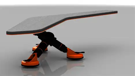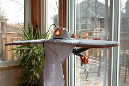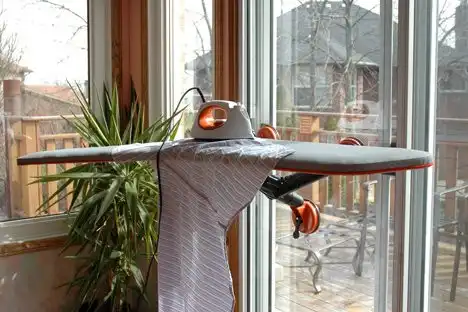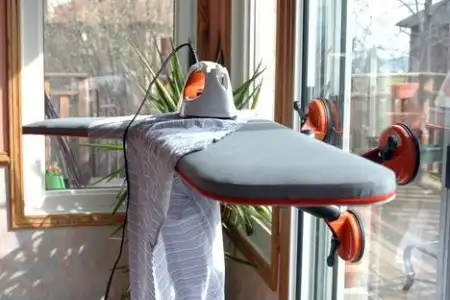 Этот странный девайс, несколько напоминающий стол, на самом деле – гладильная доска, но весьма усовершенствованная. Во-первых, она имеет форму бумеранга, что само по себе должно быть более удобно, во-вторых, на конце ножек у нее присоски, что позволит установить ее на любую поверхность, даже вертикальную, например, на стену, дверь или окно. Увидеть эту доску в действии можно на фото далее.