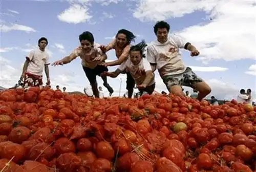 Вдохновлённые фестивалем "Томатина", проходящим ежегодно в Испании в конце августа, местные гуляки сначала искупались в томатно жиже, а потом забросали друг друга помидорами...