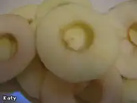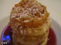 Далее положите яблоко, та же процедура посыпки и т.д. – слоями. Дать настояться 2 часа. Перед подачей полить эту конструкцию вином (в рецепте говорится о сухом белом вине, но это не обязательно ведь не пойдешь же ради белого сухого специально в магазин!).