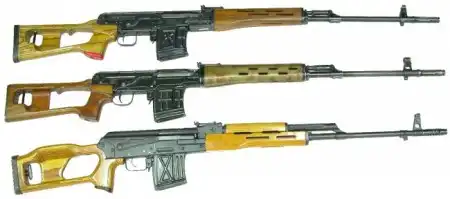 Иностранные клоны и подражания винтовке СВД, сверху вниз: винтвока Al Kadesih (Ирак), винтовка Type 85 (Тип 85, Китай) и винтовка FPK (Румыния). Обратите внимание, что только две верхние винтвоки в действительности являются копиями СВД, винтовка FPK на самом деле является увеличенной модификацией Автомата Калашникова калибра 7,62x54R оформленной "под СВД".
