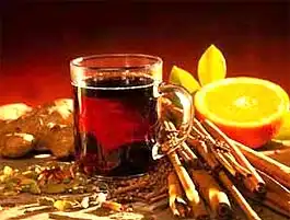 Апельсин вместе с цедрой нарезаем кружочками, заливаем вином, подогреваем и добавляем в него остальные компоненты. Процеживаем и немедленно подаем. Это отличное согревающее средство, хорошо помогает при простуде, если выпить на ночь.