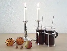 Горячительный напиток принято подавать в высоких (чтобы меньше остывал) прозрачных (чтобы любоваться цветом напитка) стаканах или в керамических чашках и обязательно с плавающими фруктами.
