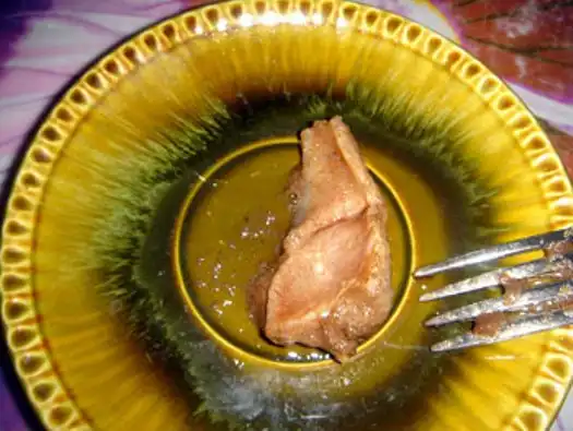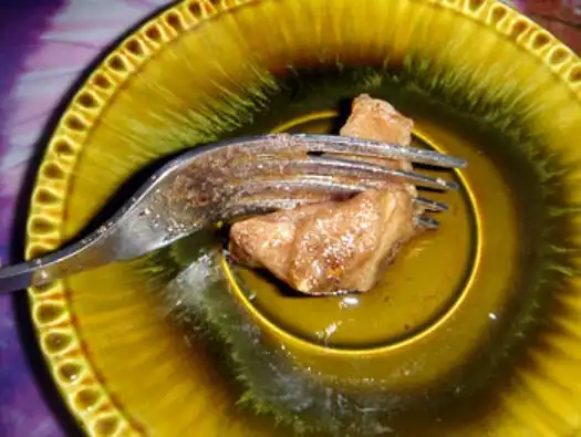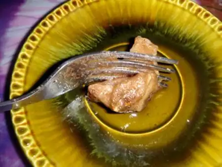 Утро 08:38.Вообще-то мясо никуда не делось, мало того - оно даже не переломилось вилкой. Цвет поменялся, да, но никаких признаков исчезновения объекта нет.