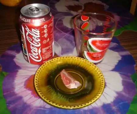 Кола - мой излюбленный напиток. В ее вредности нисколько не сомневаюсь, но не настолько же, чтобы растворить за ночь кусок мяса. Несмотря на уверенные слова комментатора, мне было трудно поверить в это. Поэтому в тот же день, вечером, было решено купить колу и провести такой же эксперимент.