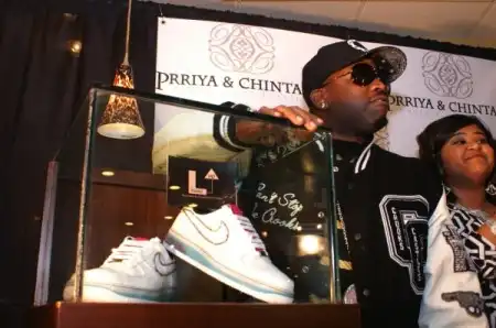 Первые кеды с золотым логотипом Nike и инкрустированными бриллиантами были подарены музыканту Антвану Паттону (Antwan Patton — Big Boi из Outkast).