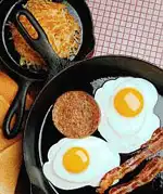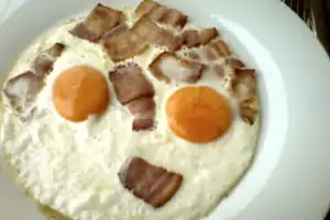 Теперь начнем нашу яичницу малость усложнять. Как всегда: от простого - к сложному. Следующий этап - яичница с салом, колбаской, ветчиной или беконом. Мясопродукт режут и вываливают на сковороду до яиц - ждут, пока под аппетитное шкворчанье с него натечет жирку, в который и разбивают яйца. Звук шипящего на сковородке сала даже дал еще одно специфическое имя для глазуньи - именно за этот звук называют ее "чирла". Особенно хорош для яичницы бекон, как будто специально создан - сало с прослойками мяса и сковородку смажет, и на зубах останется. Из колбас предпочтительна полукопченая - вареные, особенно нежирные, в яичнице никакого вкуса не имеют, а яичница с дорогим сервелатом есть профанация.