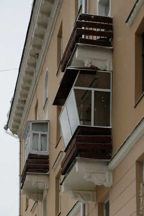 Неожиданные работы с плоскостью встречаются и в остеклении балконов. Несколько раз попадались такие будки крановщиков: