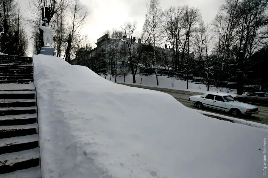 Начать надо с памятника Кирову, украшающего лестницу. Постамент не подписан, но мы уже встречали клонов в Мурманске, Ростове-на-Дону и Боровичах. Можно делать вывод о том, что данную модель Кирова в плохие города не завозили.