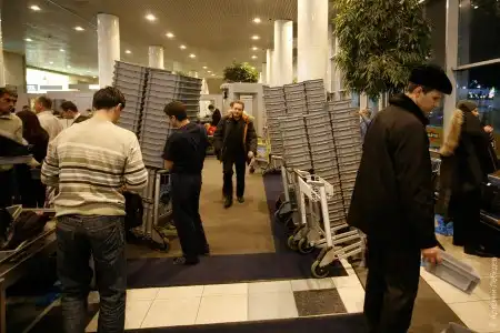 В Домодедовском аэропорту новая мода - заваливать все проходы серыми поддонами для одежды. Появилась и специальная профессия - штабелеровщик поддонов для перевозки их на десять метров.