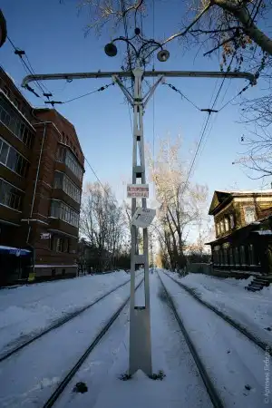 Томск от других городов отличают две характерные детали. Первая - столбы с контактными проводами расположены посередине трамвайных путей. Это сразу делает улицу похожей на открытку начала XX века, несмотря на то, что слева уже стоит какая-то кирпичная дрянь: