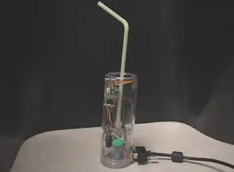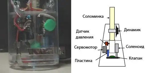 Симулятор представляет собой стакан с электрической начинкой и соломинкой наверху. Начинка: клапан с электромагнитным приводом, запирающий соломинку снизу, динамик, плотно присоединённый к соломинке и некая овальная пластина, вращаемая электроприводом вблизи среза соломинки. Вот, в основном, и всё.