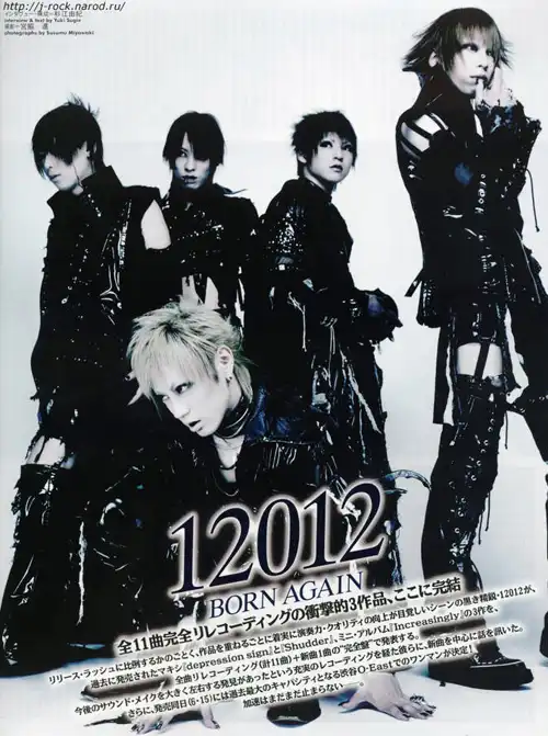 Группа 12012 (ichi ni zero ichi ni) появилась 1 мая 2003 года. Состав не менялся ни разу. Участники были набраны из распавшихся ранее indies групп.Стиль музыки определить довольно сложно, тем более, 12012 выработали свой звук, характерный для их группы. Но, если грубо говорить, то это тяжелый рок, агрессивный, но мелодичный. Быстрый ритм песен, жесткий звук гитар, отлично слышимые ударные и бас. Прибавьте к этому всему вопли, визги, рычания, крики, истерический смех и прочие невероятные звуки, которые издает вокалист, при этом еще умудряясь и петь.