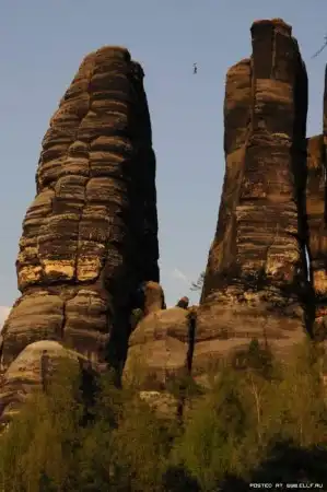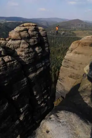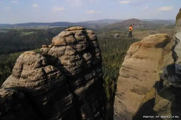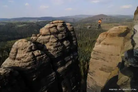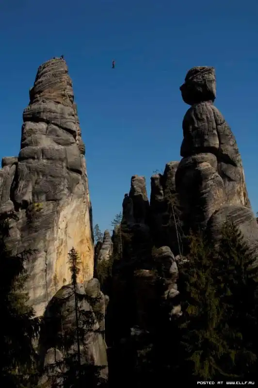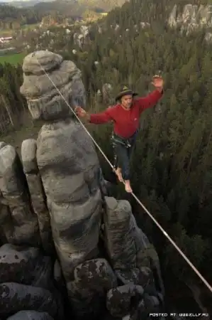 Легендарный австрийский скалолаз, акробат и фотограф Хайнц Зак на прошлых выходных совершил экстравагантное прохождение по тросу (более 30 м), навешенному между впечатляющими скальными башнями Starosta и Starostova в Adr, СВ Богемия, Чехия.