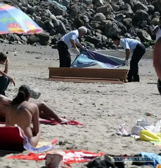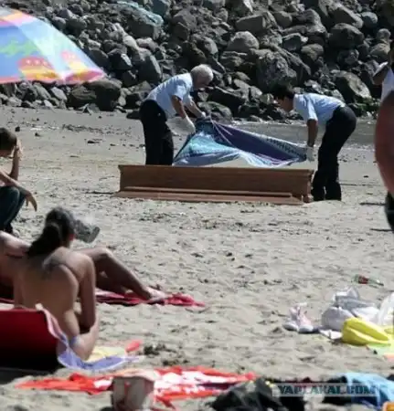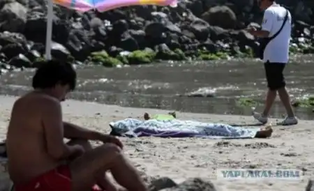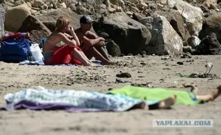 Тихо загорала парочка на пляже. От жары спасаясь прикрылись они покрывалами и тихо дремали под горячим солнцем...