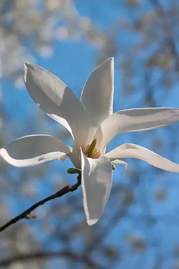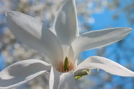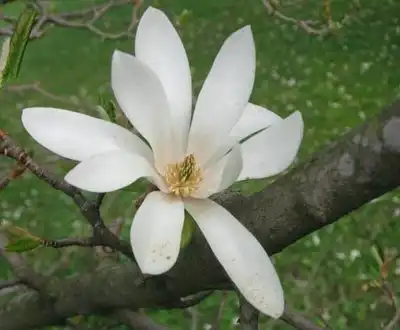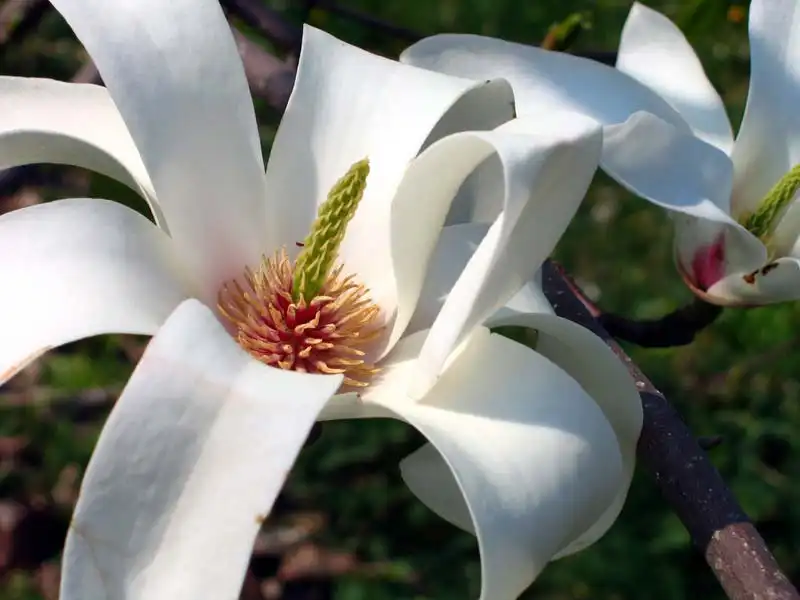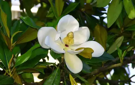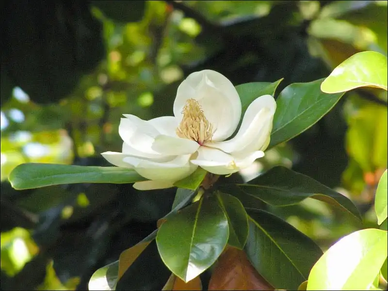 Но более всего известна вечнозеленая магнолия юга. Высота взрослого дерева достигает 30 метров. Увешанное глянцевитыми кожистыми листьями и белыми чашеобразными цветами, оно напоминает ярко освещенную новогоднюю елку. Запах цветов пряный, дурманно пьянящий. Перенасыщенный им воздух может вызвать головокружение и даже обморочное состояние.