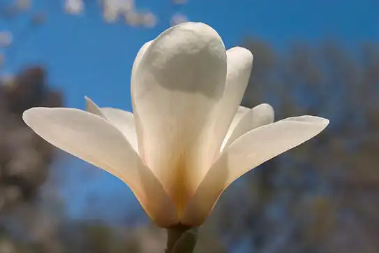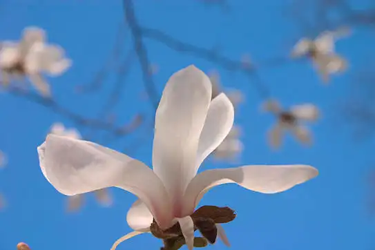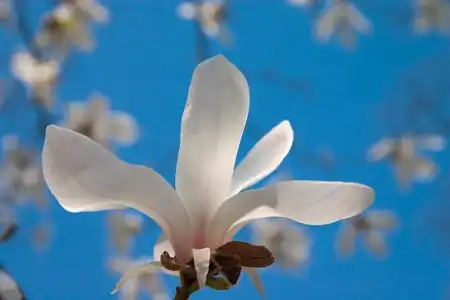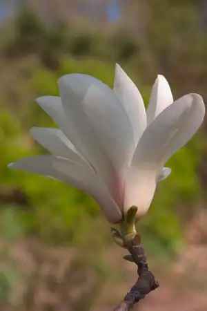По китайским преданиям, в давние времена злые хунхузы напали на мирное китайское селение, перебили мужчин, стариков и детей, забрали скот, уничтожили посевы риса, а сто самых красивых девушек связали и оставили на площади. Девяносто девять дней и ночей веселились захватчики, и каждое утро убивали одну из пленниц. Когда пришел черед умирать последней, обняла она землю, на которой лежали мертвые тела подруг, и начала горько причитать: "Родная земля! Ты растила наших отцов и матерей, ты видела смерть и наши муки. Не допусти, чтобы тлен опустошил наши молодые тела. Не дай нам исчезнуть навсегда!" А когда пьяные хунхузы наутро проснулись, на площади не оказалось ни одной девушки, только большое красивое дерево росло там, и сто прекрасных бело-розовых бутонов были готовы раскрыться на нем во всем своем великолепии. Разбойники в дикой злобе изрубили дерево на куски и раскидали на быстрых конях по степям и предгорьям. Но куда падала часть волшебного дерева, на том месте появлялось новое растение, на котором каждую весну зацветало сто нежных бутонов, сто воскресших девичьих сердец. Этим деревом была магнолия.