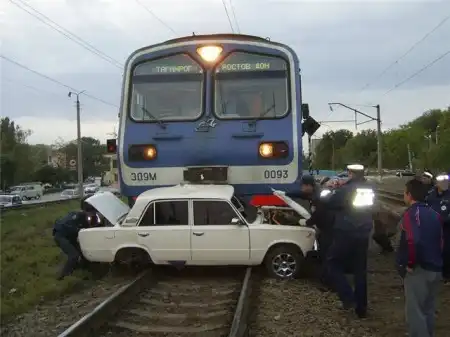 30.09.08 из Таганрога в Ростов двигался электропоезд. На одном из переездов произошло ДТП, женщина 57 лет объехала шлагбаум и выехала на переезд. Причиной ДТП стала грубое нарушение ПДД водителем автомобиля, оправданием послужило то, что женщина думала, что электропоезд остановится на площадке Красный Котельщик, которая располагалась перед переездом, но она не угадала, электропоезд оказался скорым и остановки на этой станции не предполагалось. Результат "горячей" встречи Вы можете видеть на фото.