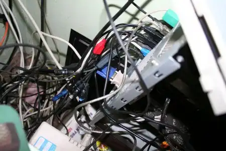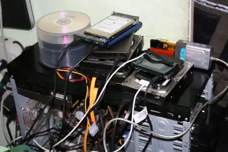 8 жестких дисков, 3 внешних жестких диска, iPod, 3 телефона(как флешки), 2 картридера, 7 флешек... и один флопповод:) (второй не смогли найти, поэтому диска B нет). Железом поделились 6 человек.