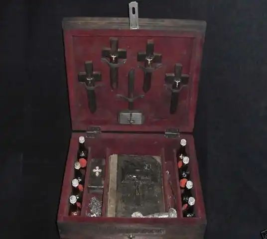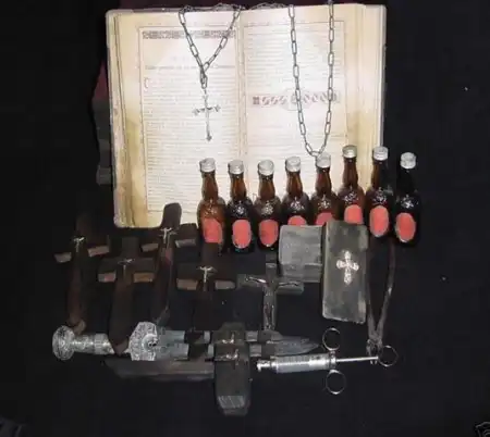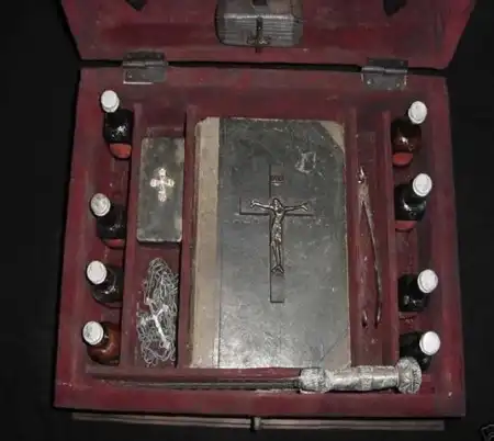 One wooden hammer (6.5 inches long), four stakes 6 inches-each) --- the wooden hammer has applied a small holy cross, same as the stakes; the lower side containing: prayer book, crucifix, knife and eight bottles with Pamant (holy soil), Agheazma (holy water), Mir (anointing oil), Tamaie (holy incense), Usturoi (garlic), red serum, blue serum and secret potion. We believe a romanian monk from Transylvania has created this box during the period of 1870-1890.