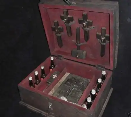 This Vampire slaying kit has been sold recently on ebay for US $1,000.00. The items enclosed in the box are as followed: