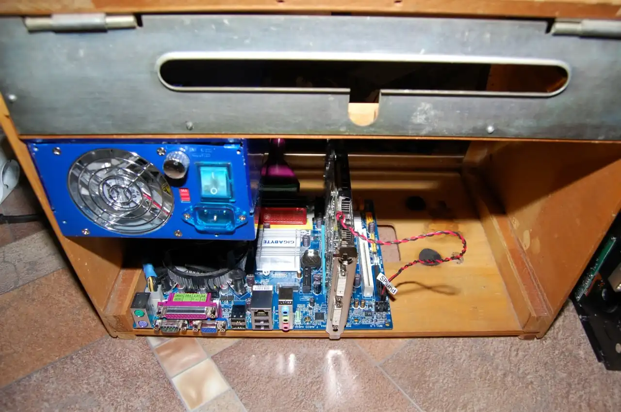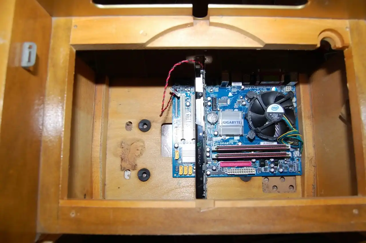 После этого я первым делом смонтировал материнскую плату, на дне корпуса радиолы.