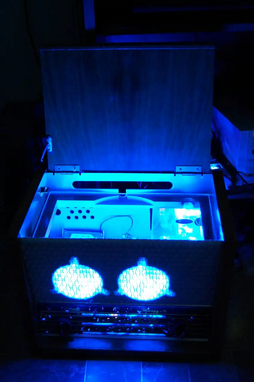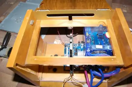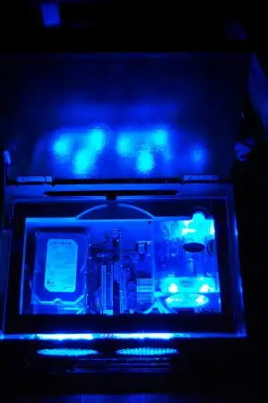 Затем я установил жосткие диски на свободное место на дне рядом с материнкой. CD-Rom ставить не стал потому что я им почти не пользуюсь, да и места подходящего для него не нашлось. Но тут моя работа встала, так как у меня не было оргстекла которое я хотел положить на то место где стоял крутящийся диск и звукосниматель. Так радиола простояла в разобранном состоянии почти месяц, пока я всё таки не нашел оргстекло. Работа закипела с новой силой и была доделана за один полный рабочий день. Из-за нехватки времени на фотографирование, при завершении работы, дальше выкладываю фото уже готового корпуса.