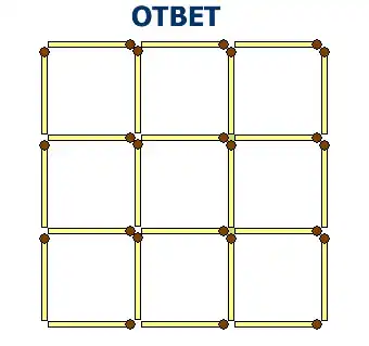 Переложите три спички из двенадцати так, чтобы получилось четыре одинаковых квадрата из трех.