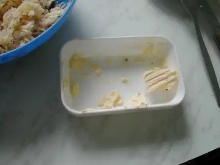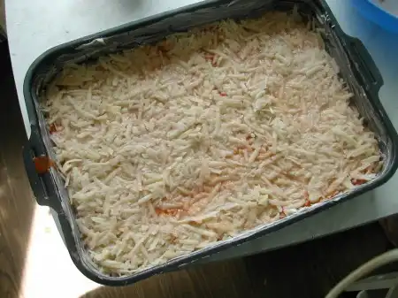 6) Смажте протвень сливочным маслом и выложите туда тертый картофель, но не все, а только половинку;