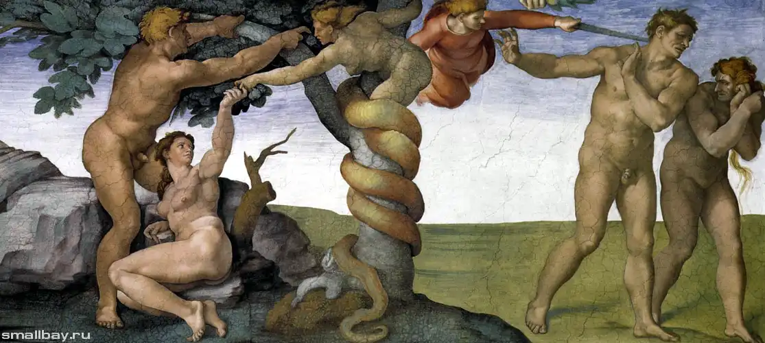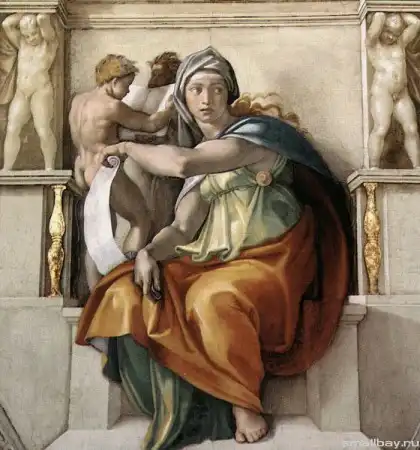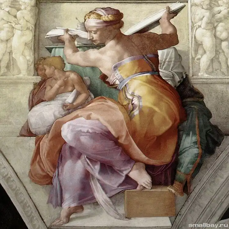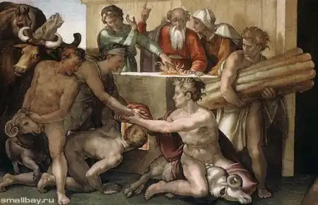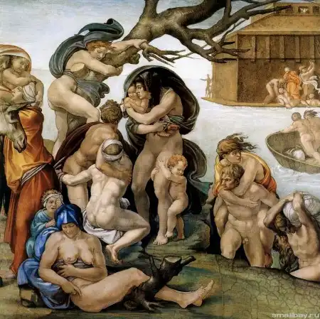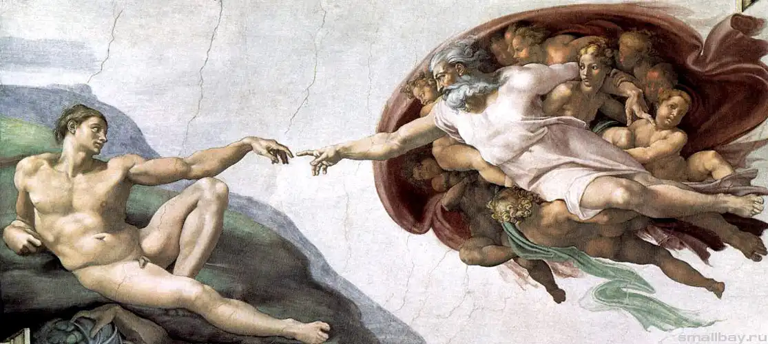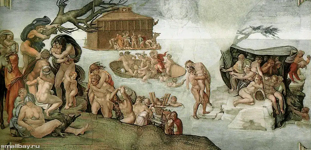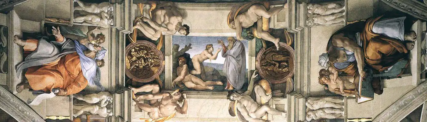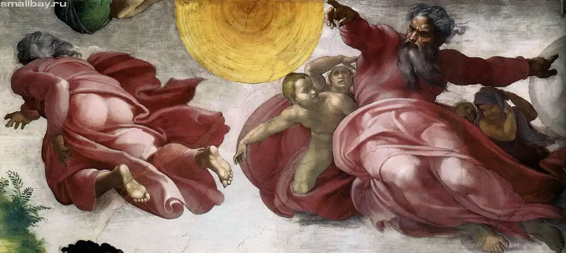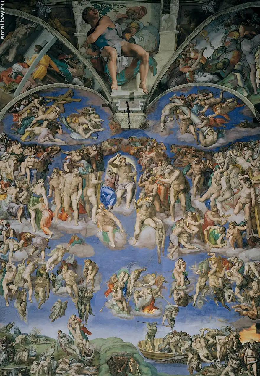 В труднейших условиях, на протяжении четырех лет, с 1508 по 1512 год работал Микеланджело, выполнив всю роспись громадного плафона (600 кв.м площади) собственноручно. В соответствии с архитектоникой капеллы он расчленил перекрывающий ее свод на ряд полей, разместив в широком центральном поле девять композиций на сюжеты из Библии о сотворении мира и первых людях на земле: “Отделение света от тьмы”, “Сотворение Адама”,“Сотворение Евы”, “Грехопадение”, “Потоп”, “Опьянение Ноя” и др. По сторонам от них, на склонах громадного свода, изображены фигуры пророков и сивилл (прорицательниц), по углам полей — сидящие обнаженные юноши; в парусах свода, распалубках и люнетах над окнами— эпизоды из Библии и так называемые предки Христа. Грандиозный ансамбль, включающий более трехсот фигур, представляется вдохновенным гимном красоте, мощи, разумучеловека, прославлением его творческого гения и героических деяний. Даже в образе бога — величественного могучего старца, подчеркнут прежде всего созидательный порыв, выраженный в движениях его рук, словно действительно способных творить миры и давать жизнь человеку. Титаническая сила, интеллект, прозорливая мудрость и возвышенная красота характеризуют образы пророков: глубоко задумавшегося скорбного Иеремию, поэтически одухотворенного Исайю, могучую Кумскую сивиллу, прекрасную юную Дельфийскую сивиллу. Создаваемым Микеланджело характерам присуща огромная сила обобщения; для каждого персонажа он находит особую позу, поворот, движение, жест. Фрескам плафона Сикстинской капеллы, как и другим живописным произведениям Микеланджело, свойственны четкость пластической лепки, напряженная выразительность рисунка и композиции, преобладание в красочной гамме приглушенных изысканных цветов. В 1516-1534 годах Микеланджело Буонарроти работал во Флоренции над проектом фасада церкви Сан-Лоренцо и архитектурно-скульптурным ансамблем усыпательницы рода Медичи в Новой сакристии той же церкви,а также над скульптурами для гробницы папы Юлия II. Мироощущение Микеланджело в 1520-е годы приобретает трагический характер. Глубокий пессимизм, охвативший его перед лицом гибели в Италии политических и гражданских свобод, кризиса ренессансного гуманизма, отразился в образном строе скульптур усыпальницы Медичи - в тяжком раздумье и бесцельном движении лишенных портретных черт статуй герцогов Лоренцо и Джулиано, в драматическом символизме четырех фигур, изображающих “Вечер”, “Ночь”, “Утро” и “День” и олицетворяющих необратимость течения времени. В 1534 Микеланджело снова переехал в Рим, где прошли последние 30 лет его жизни. Поздние живописные произведения мастера поражают трагической силой образов (фреска “Страшный Суд” на алтарной стене Сикстинской капеллы в Ватикане, 1536-1541), пронизаны горькими размышлениями о тщете человеческой жизни, о мучительной безнадежности поисков истины (отчасти предвосхищающие живопись барокко росписи капеллы Паолина в Ватикане, 1542-1550).