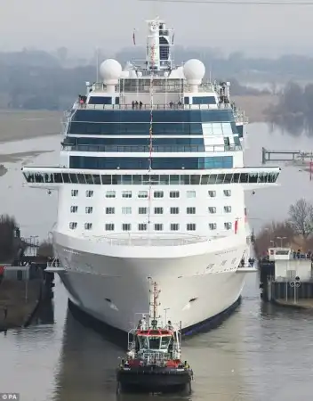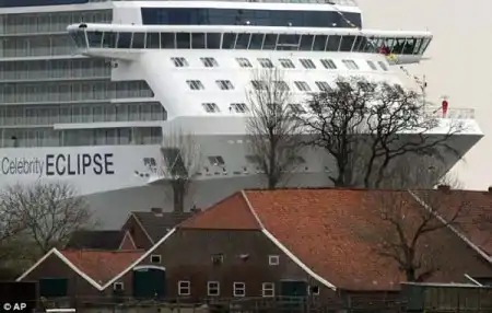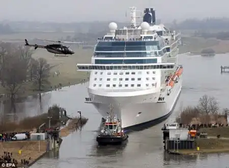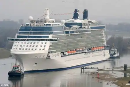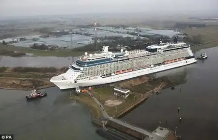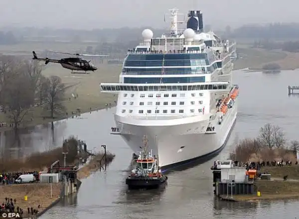 Круизный лайнер "Celebrity Eclipse", стоимостью $750 млн., отправился в свое первое плавание. При выходе из порта в Папенбурге капитану судна пришлось использовать все свое мастерство: лайнер длиной 317 м и шириной 36 м должен был пройти через узкий шлюз, при этом по сторонам оставалось меньше метра свободного пространства.