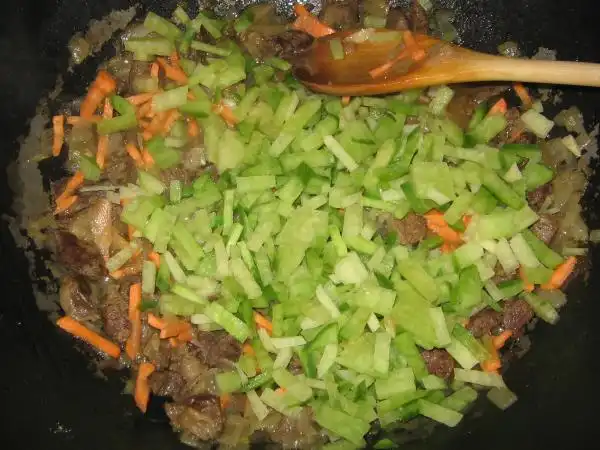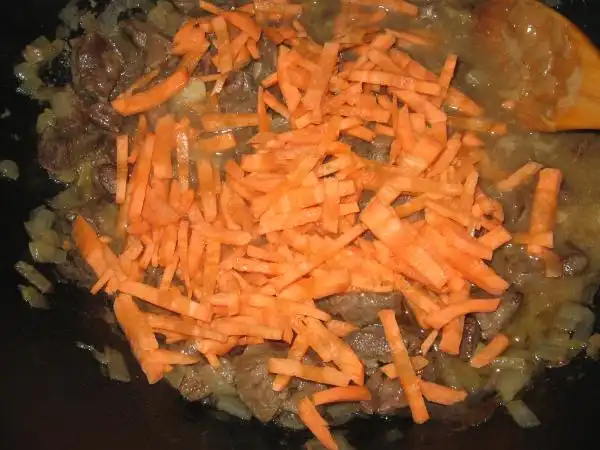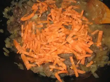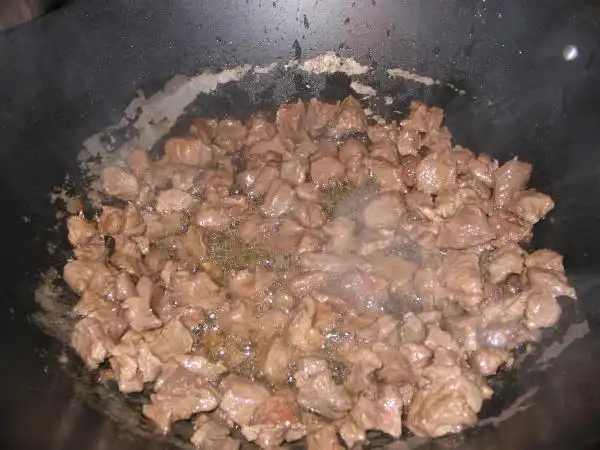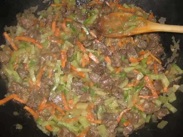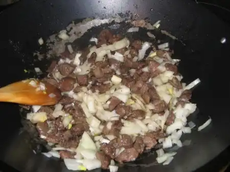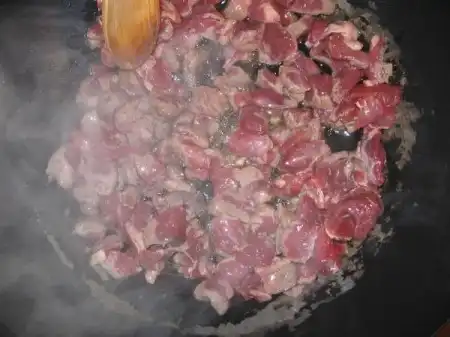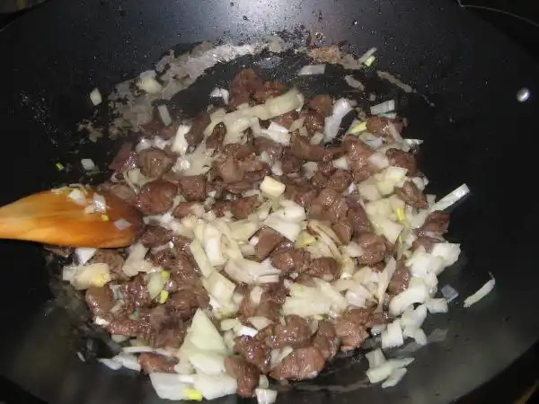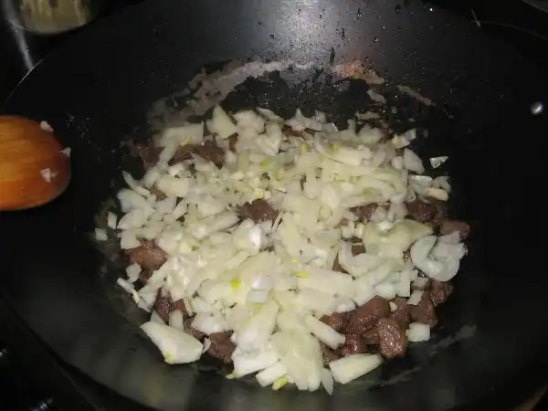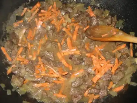 На раскаленном масле обжариваем нарезанное тонкими пластинками мясо с луком, подсаливаем.
