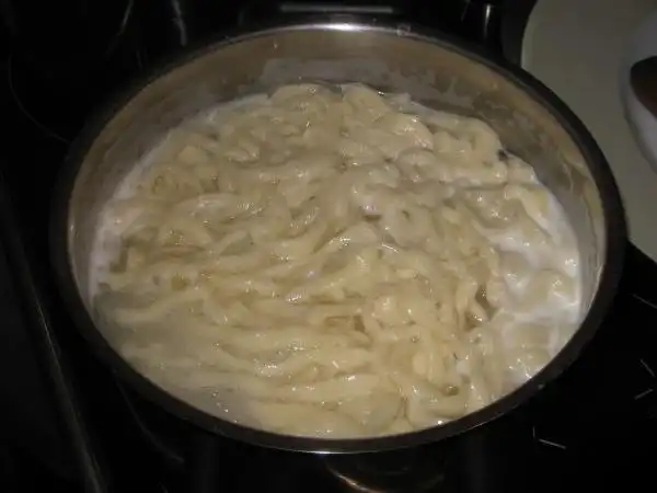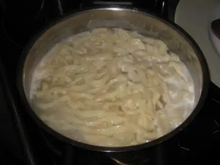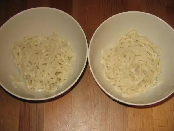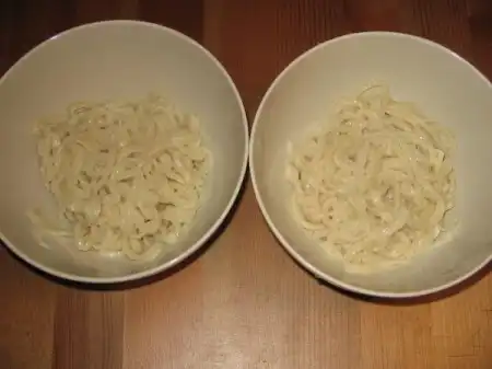 Сваренный готовый лагман некоторые промывают под краном - в холодной воде, а некоторые смазывают растительным маслом.