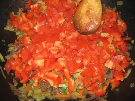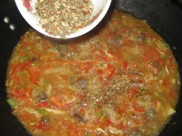 Немного добавляем кипяток, варим до желаемой готовности: в зависимости от того, хотите ли вы получить хрустящие овощи или нет. А так же, как говорилось выше, вы можете приготовить густую подливу или сделать её пожиже, добавив кипяток. Подсаливаем.