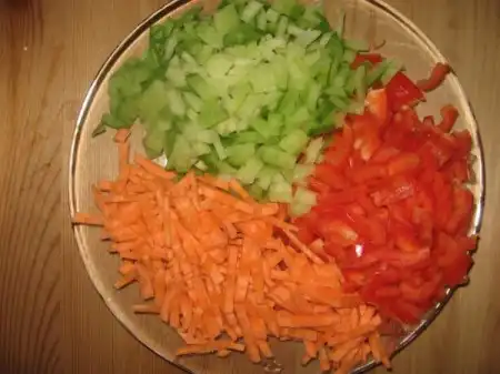 Далее кладём и обжариваем по-очереди овощи: