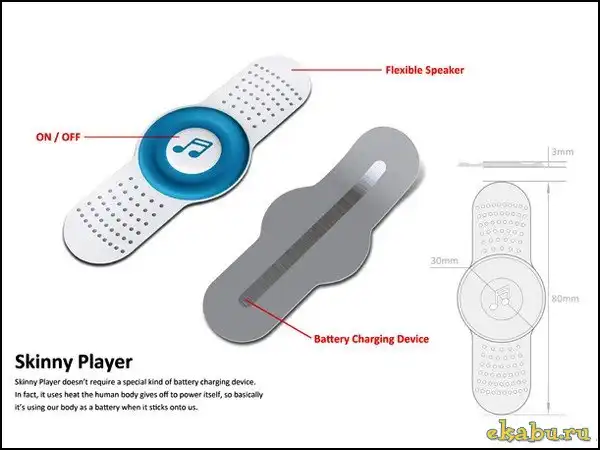 Динамики будут встроены в «ушки» этого аудиоплеера, которыми он и будет крепиться к телу человека. Хотя, наверное, удобнее было бы добавить еще и возможность подключения к Skinny Player наушников, хоть они немного и ограничат мобильность этого девайса. Впрочем, это всего лишь концепт. Кто знает, каким будет этот плеер, когда появится в реале? Вернее, если появится в реале.