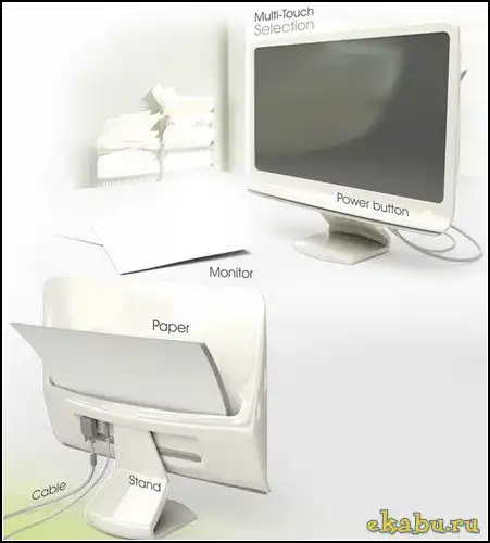 Но благодаря дизайнеру Byeong Min Choe стало понятно, как можно избежать наличия гигантского угловатого монстра на наших рабочих столах. Ведь он предложил концепт устройства под названием Document Extractor – Combi Monitor, которое представляет собой … подставку для монитора, со встроенным в нее принтером.