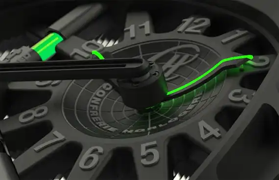 Hublot продолжает поиск идеальной формы отображения времени. Название La Clé Du Temps переводится как ключ времени и отражает функционал модели: по желанию владельца время можно замедлить или ускорить, а при необходимости вернуться к обычному. Персональная машина времени облачена в черный матовый корпус с прозрачной секцией для турбийона. В левом углу циферблата расположен индикатор запаса хода, выше селектор для управления временем, а в правом углу – непосредственно часы.
