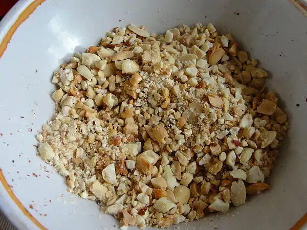 К печенью можно добавить орехи, сухофрукты, цукаты, всё, что есть. Я взяла арахис (самый дешёвый и доступный орех), обжарила на сухой сковородке – жареные орехи всегда вкуснее и ароматнее сырых. Почистила от шкурок и измельчила кухонным молоточком.