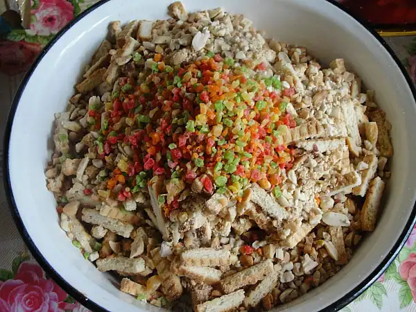 Смешала его с орехами. «Поскребла по сусекам», нашла у себя цукатную крошку. Всыплем пару ложек и все старательно перемешаем.
