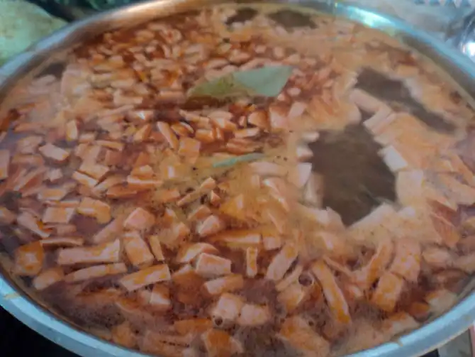 Выливаем содержимое сковородки в кастрюлю. Доводим до кипения. Добавляем лавровый лист. Вливаем в солянку примерно стакан огуречного рассола. Если его мало, сгодится рассол из-под оливок.