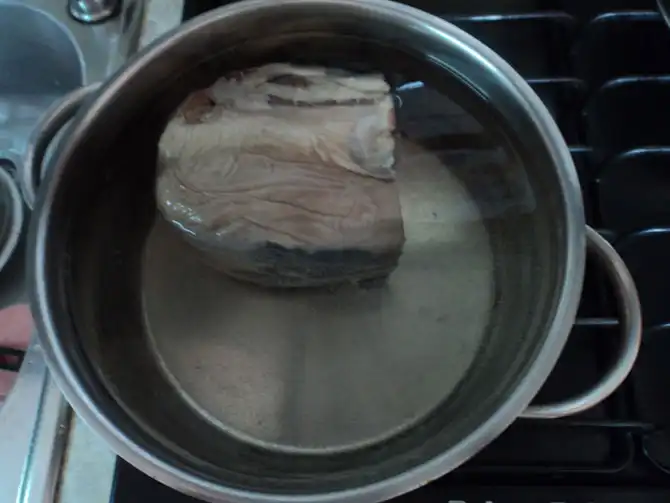 Язык нужно отварить заранее, лучше накануне. В отдельную кастрюлю наливаем холодной воды, погружаем язык, даем закипеть. Снимаем пенку и варим часа два. Затем сразу же вытаскиваем язык и опускаем в ледяную воду. Тогда шкурку можно будет снять чулком. Бульон не выливаем! Пусть он постоит часа 4.