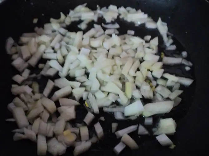 На поверхности застынет жирок. На нем мы обжарим лук. Аккуратно снимаем его ложкой и кладем на сковородку. Сковородка нам понадобится большая.