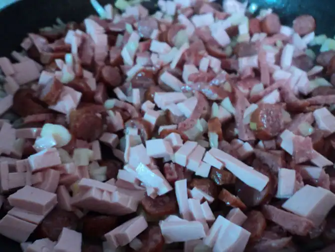 Минуты через 3 – вареную колбасу и сервелат. Я не люблю в солянке «колбасные бревна», поэтому режу помельче. Еще через 5 минут добавляем порезанные язык и говядину.