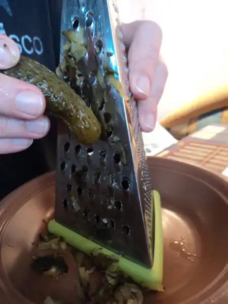 На крупной терке трем соленые огурчики. Рассол от них нам еще понадобится!