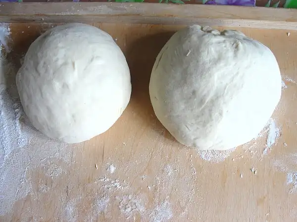 Добавим соль, сахар, перемешаем. Теперь выльем воду с дрожжами и будем добавлять муку. Нельзя сказать точно, сколько понадобится муки, каждый раз по-разному. Просто будем подсыпать понемногу и вымешивать, пока тесто перестанет липнуть к рукам. Старайтесь не «переборщить» с мукой, чтобы не получить тугое тесто, оно долго подходит и тяжело раскатывается. Стараемся вымесить тесто мягкое и эластичное – с таким тестом приятно работать. Вот, готов колобок.