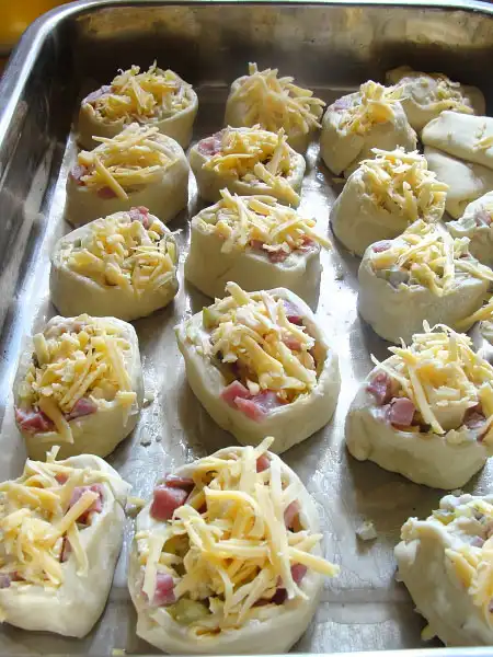 Так же поступлю со второй половиной теста. Противень выстелю пергаментной бумагой, смажу маслом. Выложу рулетики на противень и присыплю сверху сыром.