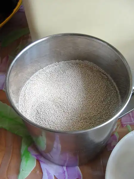 Дрожжи размешаем в воде (маленький пакетик или столовая ложка без горки).